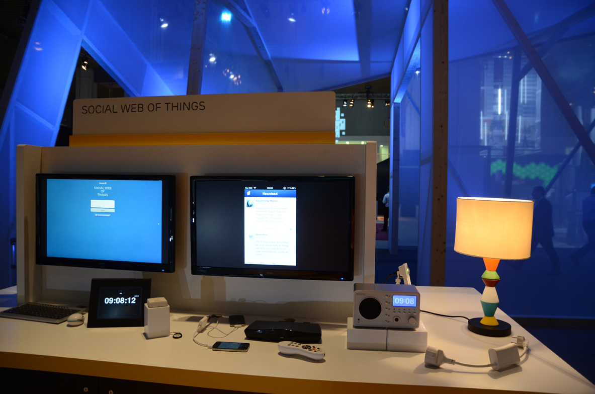 Outside Ericsson’s Hall 6 we showed the Social Web of Things concept with connected Lego Mindstorm robots that collected used coffee cups, that watered plants and sorting our the laundry for you. All this in a future near you!